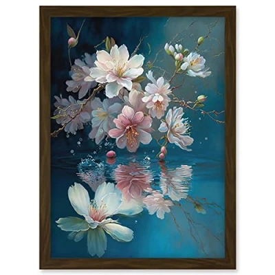 Artery8 Cherry Blossom Branch Dancing Over Water Modern Watercolour Painting Artwork Framed Wall Art Print A4