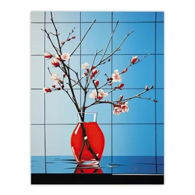 Artery8 Cherry Blossom Branch in Vase Floral Artwork Blue Red Glass Table Reflections Flower Blooms by Window Large Wall Art Poster Print Thick Paper 18X24 Inch