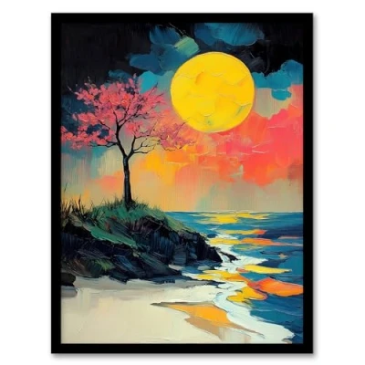 Artery8 Cherry Blossom Tree by Shore Coastal Sunset Living Room Artwork Framed Wall Art Print A4