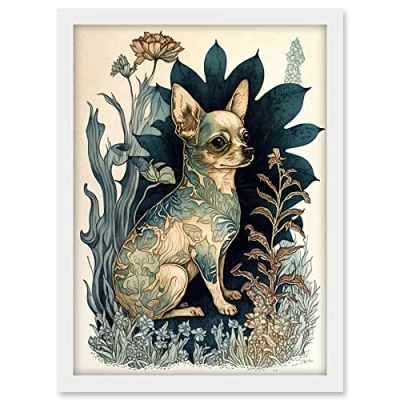 Artery8 Chihuahua Dog With Floral Pattern Fur Coat Modern Portrait in Flower Field Illustration Artwork Framed A3 Wall Art Print
