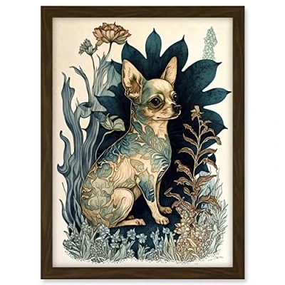 Artery8 Chihuahua Dog With Floral Pattern Fur Coat Modern Portrait in Flower Field Illustration Artwork Framed A3 Wall Art Print