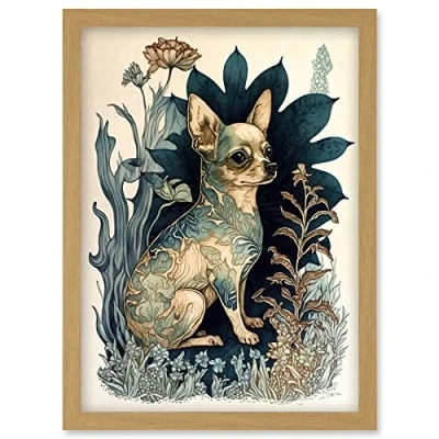 Artery8 Chihuahua Dog With Floral Pattern Fur Coat Modern Portrait in Flower Field Illustration Artwork Framed Wall Art Print A4
