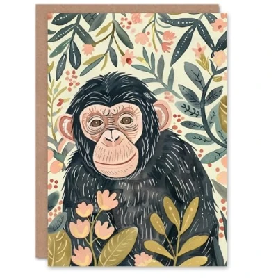 Artery8 Chimpanzee Ape Monkey With Pink Flowers Watercolour Blank For Him Or Her Art Birthday Card