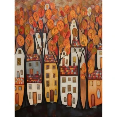Artery8 Cityscape With Trees In Autumn Contemporary Folk Art Painting Large Wall Poster Print Thick Paper 18X24 Inch