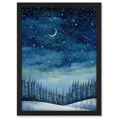 Artery8 Clear Sky Starry Night in Forest Covered with Snow Oil Painting Crescent Moon Winter Landscape Artwork Framed A3 Wall Art Print