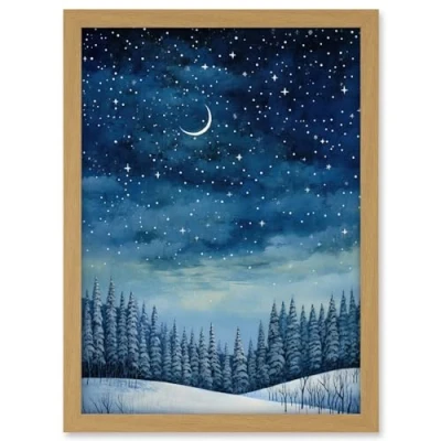 Artery8 Clear Sky Starry Night in Forest Covered with Snow Oil Painting Crescent Moon Winter Landscape Artwork Framed A3 Wall Art Print