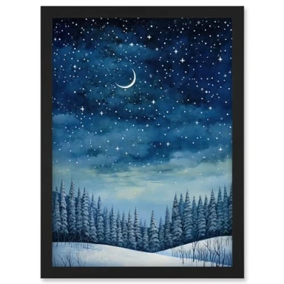 Artery8 Clear Sky Starry Night in Forest Covered with Snow Oil Painting Crescent Moon Winter Landscape Artwork Framed Wall Art Print A4