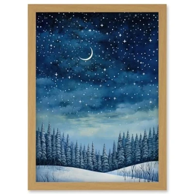 Artery8 Clear Sky Starry Night in Forest Covered with Snow Oil Painting Crescent Moon Winter Landscape Artwork Framed Wall Art Print A4