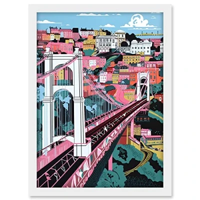 Artery8 Clifton Suspension Bridge Pink and Teal Cityscape Artwork Framed A3 Wall Art Print
