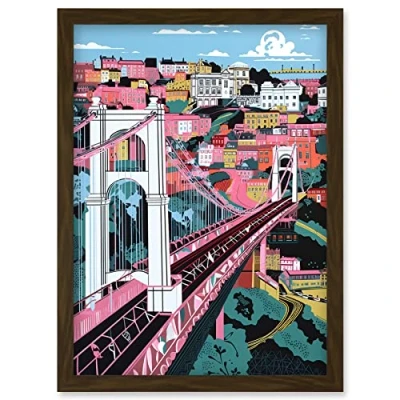 Artery8 Clifton Suspension Bridge Pink and Teal Cityscape Artwork Framed Wall Art Print A4