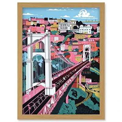 Artery8 Clifton Suspension Bridge Pink and Teal Cityscape Artwork Framed Wall Art Print A4
