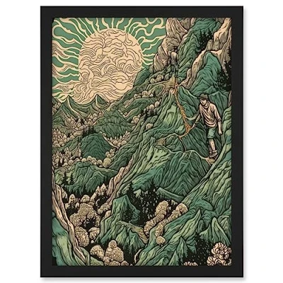 Artery8 Climb Every Mountain Hikers at Sunrise Linocut Artwork Framed A3 Wall Art Print