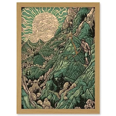 Artery8 Climb Every Mountain Hikers at Sunrise Linocut Artwork Framed Wall Art Print A4