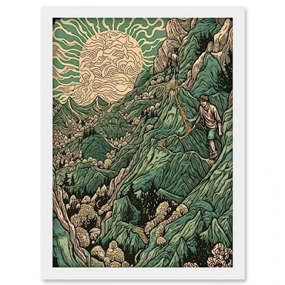 Artery8 Climb Every Mountain Hikers at Sunrise Linocut Artwork Framed Wall Art Print A4