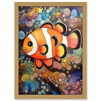 Artery8 Clownfish In Colourful Bubbles Folk Art Watercolour Painting Artwork Framed A3 Wall Print
