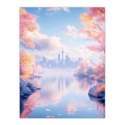 Artery8 Coastal Pink Orange Autumn Trees Lake Cityscape Living Room Extra Large XL Wall Art Poster Print