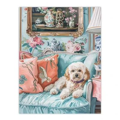 Artery8 Cockapoo Dog Lover Pink Teal Couch Pet Portrait For Living Room Large Wall Art Poster Print Thick Paper 18X24 Inch