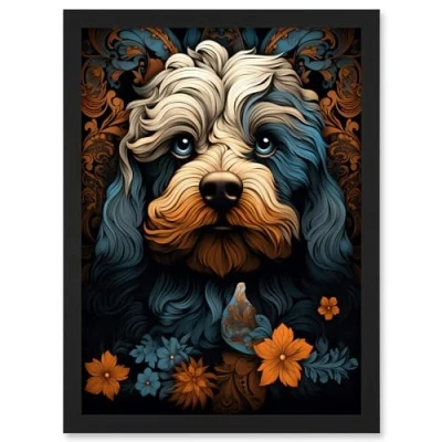 Artery8 Cockapoo Dog with Flower Patterns Art Nouveau Artwork Orange Blue Floral Portrait Design Framed A3 Wall Print