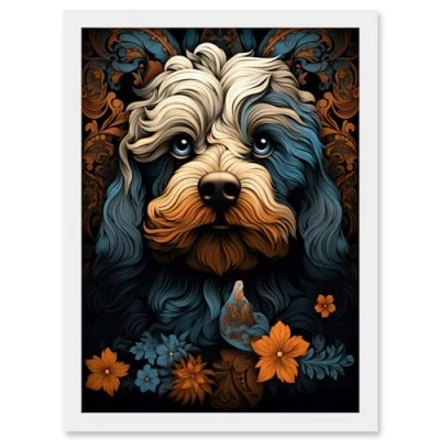 Artery8 Cockapoo Dog with Flower Patterns Art Nouveau Artwork Orange Blue Floral Portrait Design Framed Wall Print A4