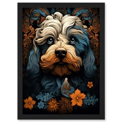 Artery8 Cockapoo Dog with Flower Patterns Art Nouveau Artwork Orange Blue Floral Portrait Design Framed Wall Print A4