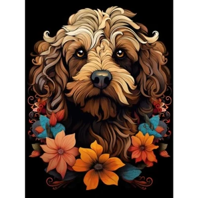 Artery8 Cockapoo Dog with Flowers Artwork Orange Brown Blue Floral Art Nouveau Portrait on Black Extra Large XL Wall Poster Print