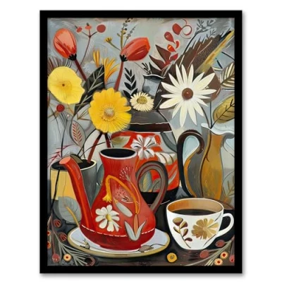 Artery8 Coffee Pot Cup Wildflower Bouquet Vase Painting Kitchen Artwork Framed Wall Art Print A4