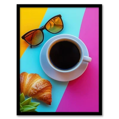 Artery8 Coffee Sunglasses Croissant Colourful Modern Kitchen Artwork Framed Wall Art Print A4