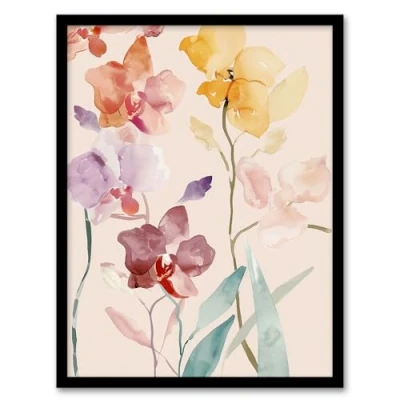 Artery8 Colourful Abstract Orchid Flowers Watercolour Living Room Artwork Framed Wall Art Print A4