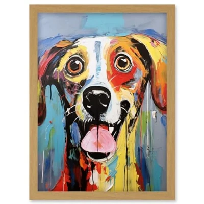 Artery8 Colourful Dog Portrait Artwork by Jason Brydson Happy Face Oil Painting Bold Bright Vibrant Framed Wall Art Print A4