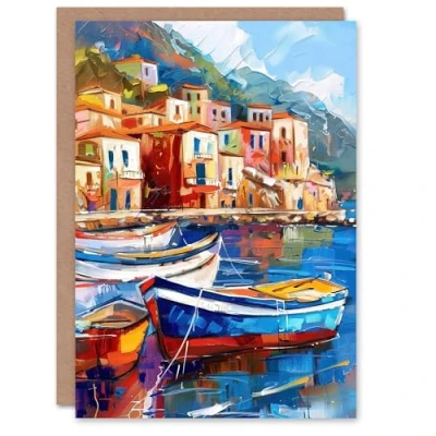 Artery8 Colourful Fishing Village Oil Painting Harbour Greeting Birthday Card Him Her All Blank