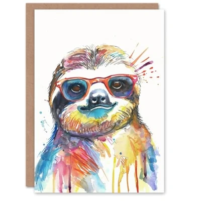 Artery8 Colourful Watercolour Sloth Sunglasses Cute Smile Blank For Him Or Her Art Birthday Card