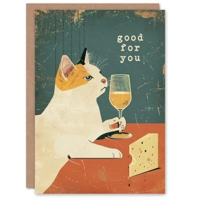 Artery8 Congratulations Card Wino Cat Cheese Lover Fun Artwork Sophisticated Pet For Him Her Man Woman Girl Boy Wife Husband Greeting