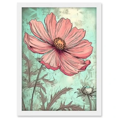 Artery8 Cosmos Flower Bloom Soft Pink and Teal Watercolour Artwork Framed A3 Wall Art Print