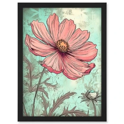 Artery8 Cosmos Flower Bloom Soft Pink and Teal Watercolour Artwork Framed A3 Wall Art Print