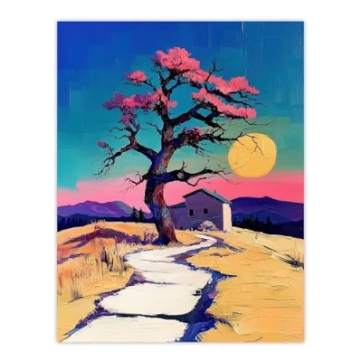 Artery8 Cottage Cherry Blossom Tree Sunrise Landscape Living Room Large Wall Art Poster Print Thick Paper 18X24 Inch