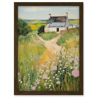 Artery8 Country Farmhouse Cottage Scene Traditional Landscape Oil Painting Meadows Countryside Summer Artwork Framed A3 Wall Art Print