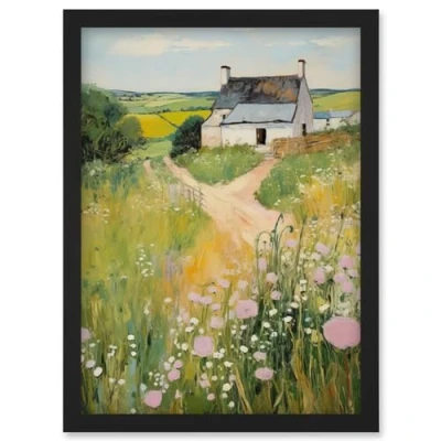 Artery8 Country Farmhouse Cottage Scene Traditional Landscape Oil Painting Meadows Countryside Summer Artwork Framed Wall Art Print A4