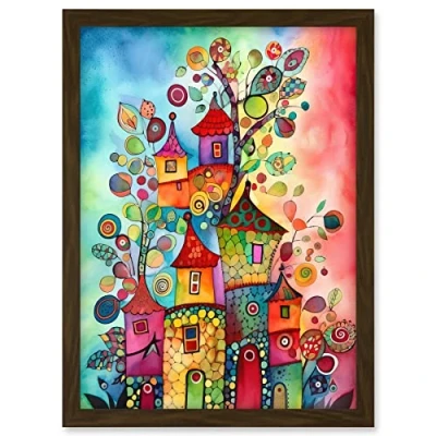 Artery8 Country Houses Concept Folk Art Watercolour Painting Artwork Framed A3 Wall Print