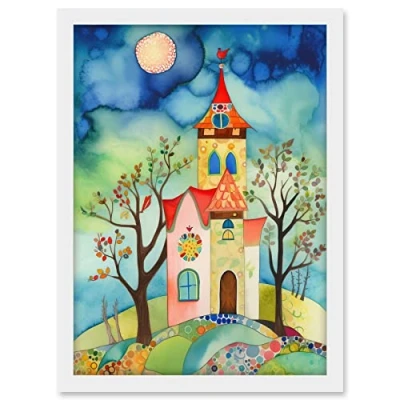 Artery8 Countryside Chapel Folk Art Watercolour Painting Artwork Framed A3 Wall Print