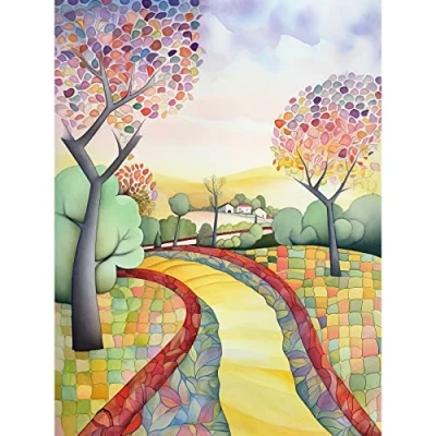 Artery8 Countryside Path In Autumn Folk Art Landscape Pastel Watercolour Painting Extra Large XL Wall Poster Print