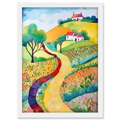 Artery8 Countryside Path In Spring Folk Art Landscape Watercolour Painting Artwork Framed A3 Wall Print