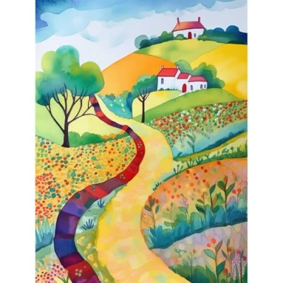 Artery8 Countryside Path In Spring Folk Art Landscape Watercolour Painting Extra Large XL Wall Poster Print