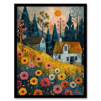 Artery8 Countryside Spring Hill House Daisy Flowers For Living Room Artwork Framed Wall Art Print A4