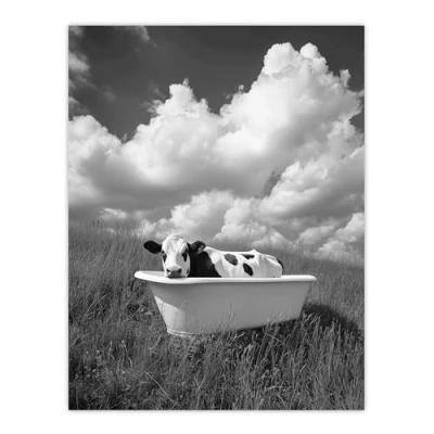 Artery8 Cow in Bathtub a Field Black White Surreal Bathroom Toilet Large Wall Art Poster Print Thick Paper 18X24 Inch