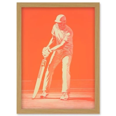 Artery8 Cricket Player Flick Shot Sport Artwork Orange Monochrome Athlete Portrait Framed Wall Art Print A4