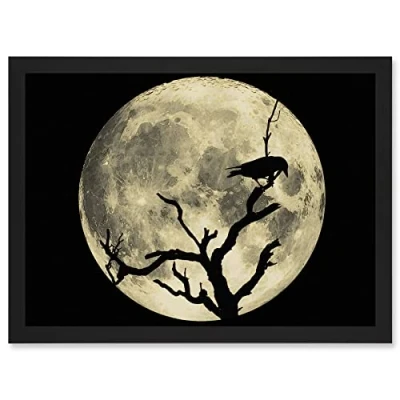 Artery8 Crow Tree Perch Silhouette Moon Black Grey A4 Artwork Framed Wall Art Print