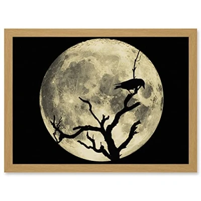 Artery8 Crow Tree Perch Silhouette Moon Black Grey A4 Artwork Framed Wall Art Print