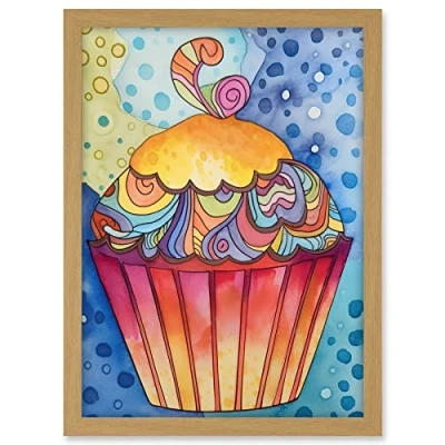 Artery8 Cupcake With Colourful Frosting Folk Art Watercolour Painting Artwork Framed A3 Wall Print