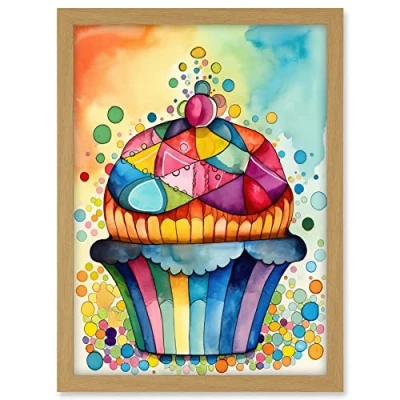 Artery8 Cupcake With Colourful Frosting Watercolour Folk Art Painting Artwork Framed A3 Wall Print