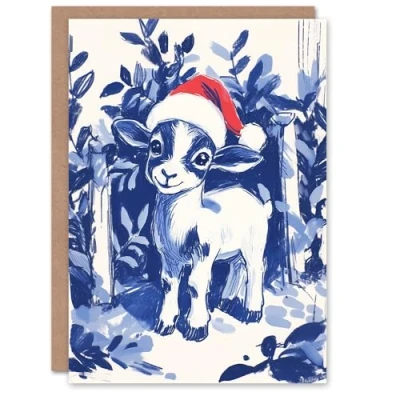 Artery8 Cute Baby Lamb With Santa Hat Blue Blank For Him Or Her Art Xmas Festive Christmas Card